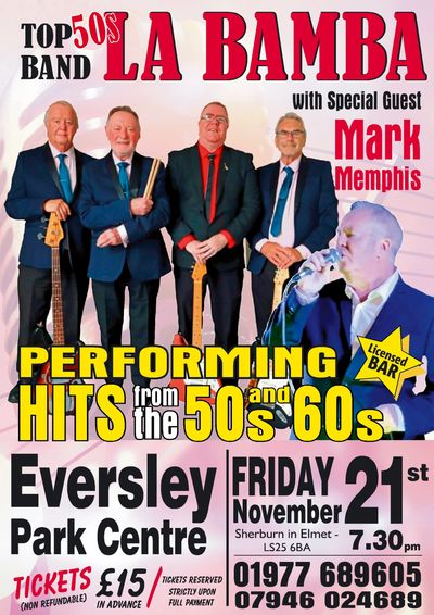 Regulars LA BAMBA and MARK MEMPHIS are back on stage rocking to the 50s and 60s. Tickets now available. Call 01977 689605 or visit Eversley Park Centre.